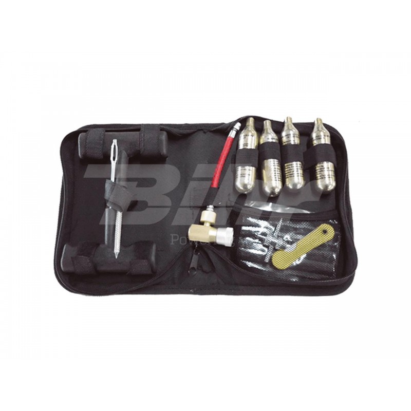 inclui ferramenta grosa, ferramenta de tiras de reparação, ferramenta para inflar, 4 garrafas de ar comprimido, cuter, 10 tiras de reparação e chave para núcleos de válvula